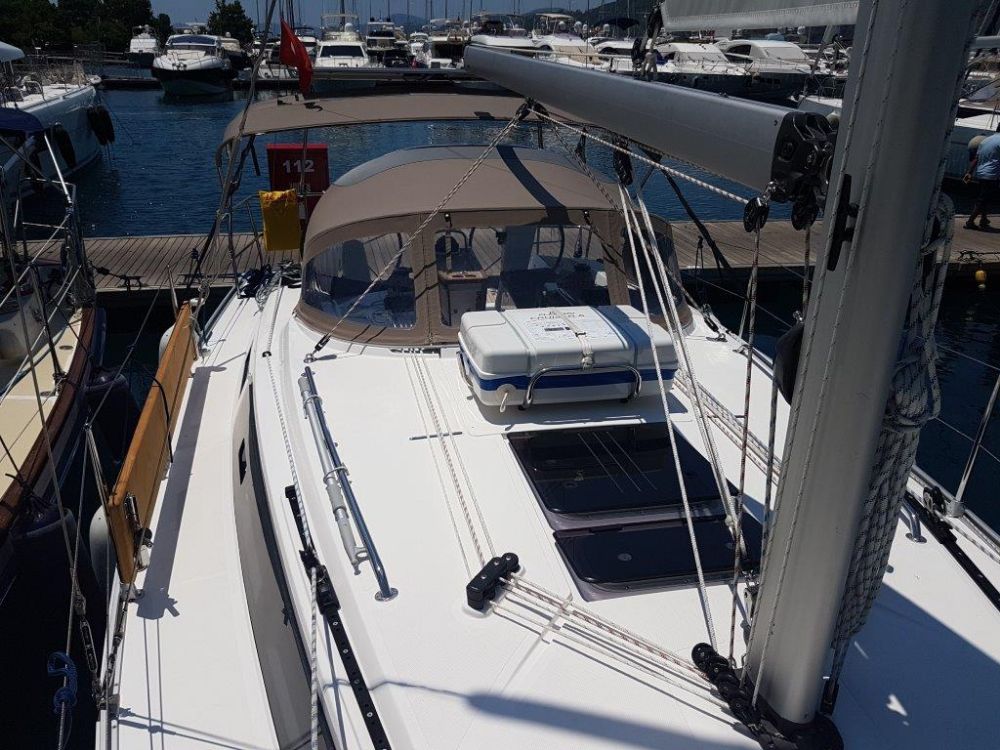 | Outside | 220 V-Landanschluss, Anker mit Kette, Ankerwinsch, Badeplattform, Biminitop, Bootshaken, Cockpitdusche, Cockpitlautsprecher, Cockpitpolster, Cockpittisch, elektr. Ankerwinsch, Fender, Festmacherleinen, Gangway, Kugelfender, Kunststoff-Eimer (Pütz), Solaranlage, Sprayhood, Teak im Cockpit, Wasserschlauch |