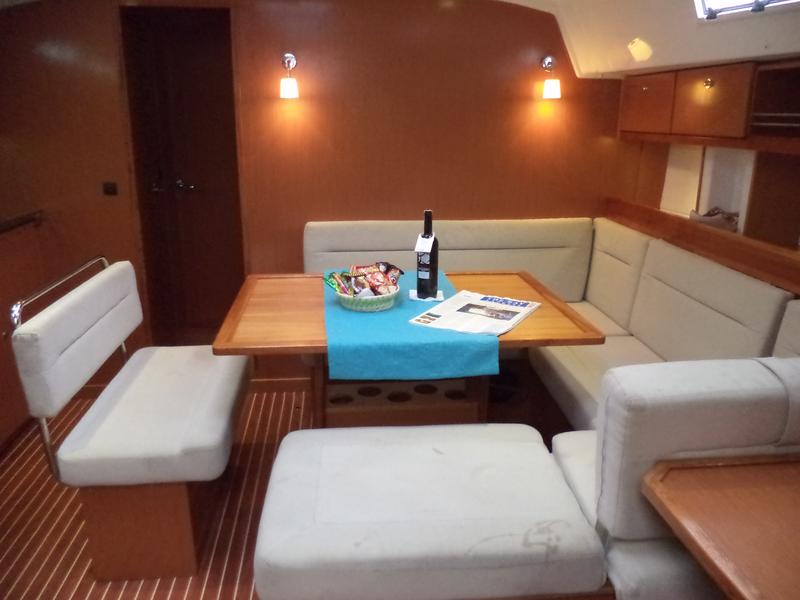 | Outside | 12 V-Anschluss, Anker mit Kette, Badeleiter, Biminitop, Bootshaken, Cockpitdusche, Cockpitlautsprecher, Cockpitpolster, Dieselkanister , elektr. Ankerwinsch, Festmacherleinen, Gangway, Kugelfender, Sprayhood, Wantenschneider, Wasserschlauch, Windex |