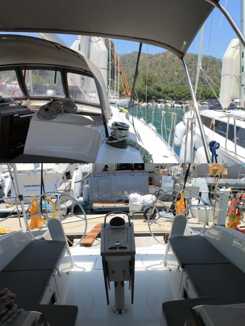 Vor Ort gibt es kein Büro von Mango-Charter. Das ist wichtig zu wissen, dann braucht man nicht danach zu suchen, wie wir das getan haben. Es gibt ein Marinabüro, dort haben wir erfahren, wo die Yacht liegt. Als wir gegen 15:30 Uhr am Boot eingetroffen sind, war dort allerdings nur das Reinigungspersonal. Eine Verständigung war nicht möglich, es konnte aber mit Mühe kommuniziert werden, daß es noch eine Stunde dauert. Die Einweisung war dann ebenfalls sprachlich mühselig und recht kurz. Ein roter Hebel im Schrank einer Kabine wurde auf meine Nachfrage mit dem Wort Anker beantwortet. Der Anker solle nur maximal bis 25 m Tiefe, oder 25 m Länge !? benutzt werden. Man solle nur jeweils 10 m am Stück raus- oder reinfahren. Offenbar war irgendein Problem bekannt, das aber nicht näher erläutert wurde. Wir haben das Problem dann aber schnell erkannt. Egal, ob man den Motor im Leerlauf beim Ankermanöver hochdreht, oder alle anderen Verbraucher abschaltet, beim Einholen springt die Sicherung nach 3 m raus und es dauert etwa 10 Sek. bis man sie dann wieder reindrücken kann. Da man in diesem Revier überall dicht an dicht mit Anker und Landleine festmacht und teilweise erheblicher Seitenwind herrscht, hat uns das streckenweise große Probleme verursacht. Bei der Rückgabe im Hafen (am Landstrom), hat es dann erstaunlicherweise problemlos funktioniert.