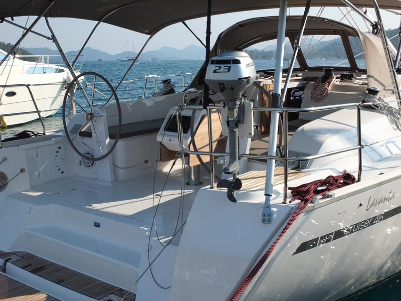 | Outside | 220 V-Landanschluss, Anker mit Kette, Badeleiter, Badeplattform, Biminitop, Bootshaken, Cockpitdusche, Cockpitlautsprecher, Cockpitpolster, Dieselkanister , elektr. Ankerwinsch, Fender, Festmacherleinen, Gangway, Kugelfender, Lifeline System, Sprayhood, Wantenschneider, Wasserschlauch, Windex |