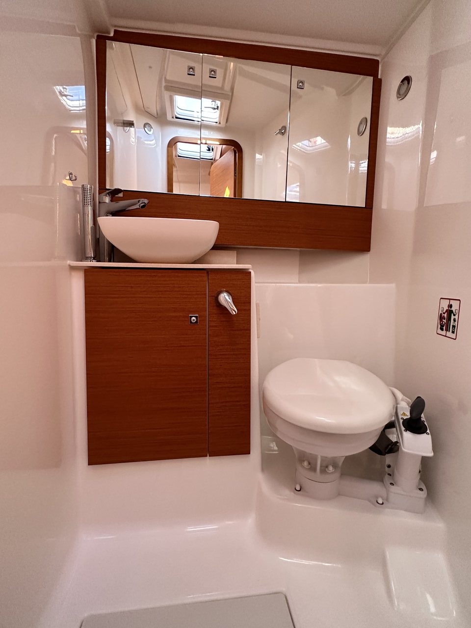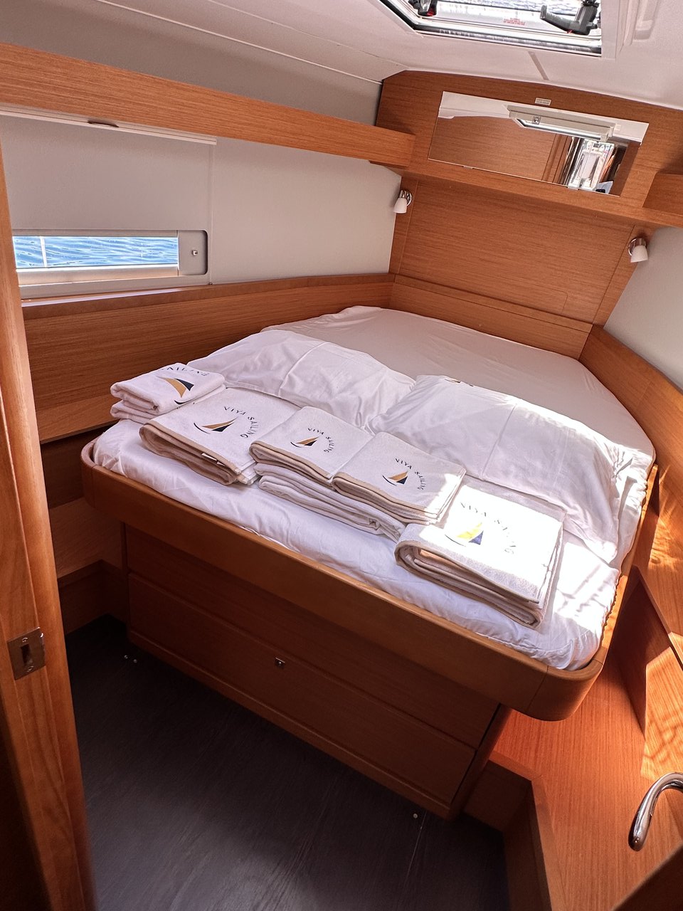 | Outside | Anker mit Kette, Ankerwinsch, Badeplattform, Biminitop, Cockpitpolster, Gangway, Solaranlage, Windex |