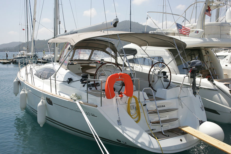 | Outside | Anker mit Kette, Badeleiter, Benzinkanister, Biminitop, Bootshaken, Cockpitlautsprecher, Cockpitleuchte, Cockpitpolster, Cockpittisch, Deckbürste, Dieselkanister , elektr. Ankerwinsch, elektr. Großwinsch, Fender, Festmacherleinen, Gangway, Kugelfender, Kunststoff-Eimer (Pütz), Schnorchelausrüstung, Solaranlage, Sonnensegel, Sprayhood, Teak im Cockpit, Wantenschneider, Wasserkanister , Wasserschlauch, Windex, Winschen |