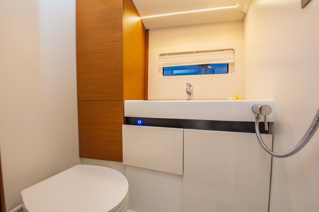 | Outside | Badeplattform, Biminitop, Cockpitdusche, Cockpittisch, elektr. Ankerwinsch, Solaranlage, Sprayhood, Teak im Cockpit |