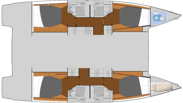 Fäkalientank, Gefrierschrank, Inverter 12V/220V, Kühlschrank, Pantryausstattung, Radio, USB Steckdosen in Salon und Kabinen, Ventilatoren in Kabinen |