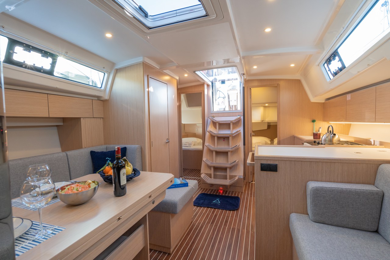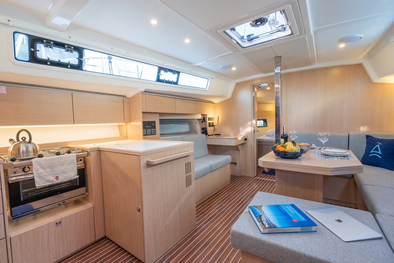 | Outside | Anker mit Kette, Badeplattform, Biminitop, Cockpitdusche, Cockpitlautsprecher, Cockpittisch, Deckbeleuchtung, elektr. Ankerwinsch, Fallwinschen, Fender, Festmacherleinen, Rodkicker, Seereling, Solaranlage, Sprayhood, Teak im Cockpit |