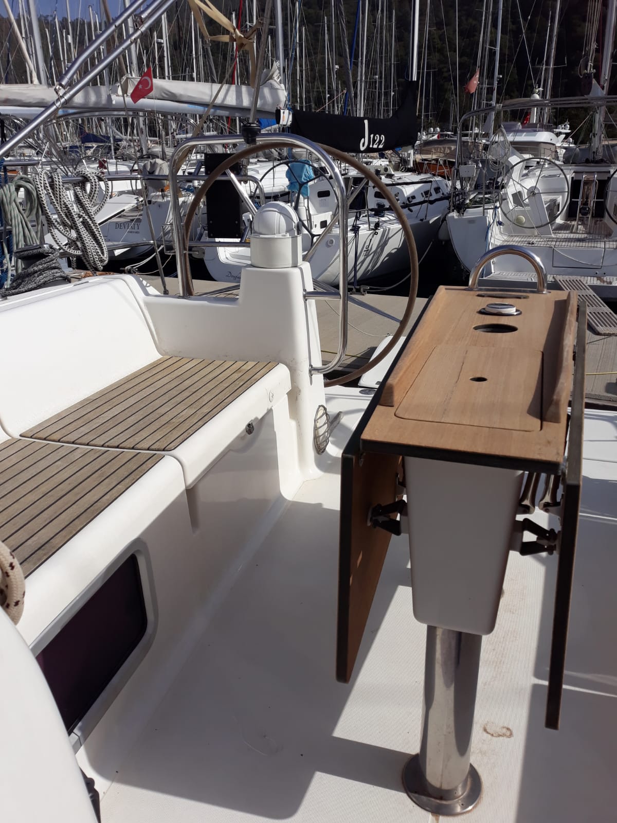 | Outside | 12 V-Anschluss, 220 V-Landanschluss, Anker mit Kette, Badeplattform, Biminitop, Bootshaken, Cockpitdusche, Cockpitpolster, Cockpittisch, Dieselkanister , elektr. Ankerwinsch, Fender, Festmacherleinen, Kugelfender, Sonnensegel, Sprayhood, Winschen |