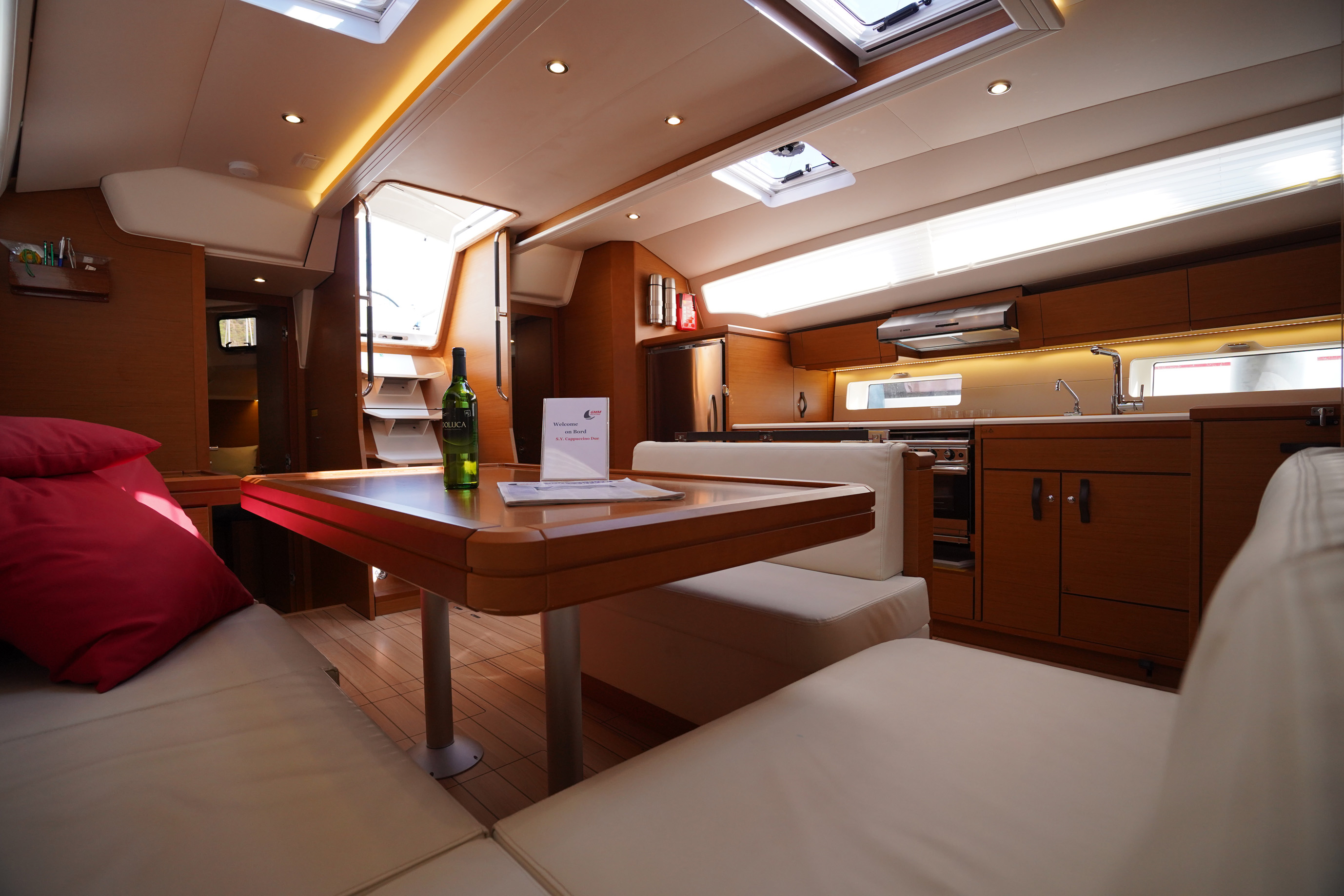 | Inside | Gasherd mit Backofen, Generator, Geschirrspüler, Heizung, Inverter 12V/220V, Kaffeemaschine, Klimaanlage (ohne Landstrombedarf), Kühlschrank, Pantryausstattung, Radio mit CD und MP3, Salontisch absenkbar, Watermaker, WC (elektr.) |