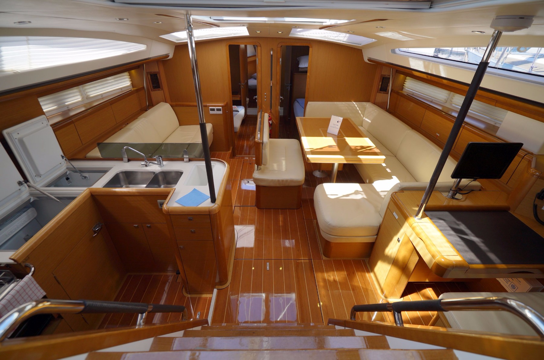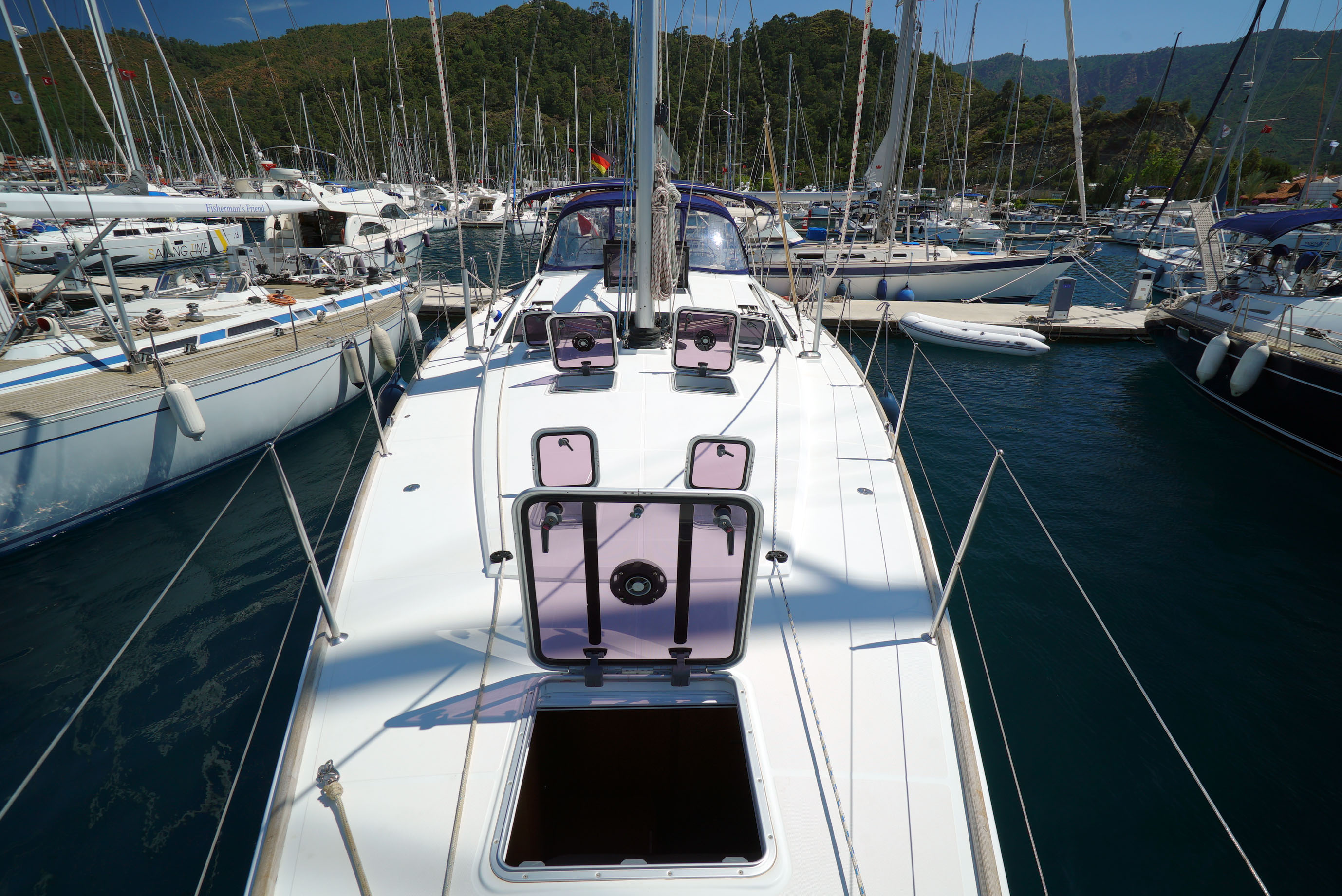 | Safety | Automatikwesten, Autopilot, Bilgepumpe, Bootsmannstuhl, Bordapotheke, Bordwerkzeug, Bugstrahlruder, elektr. Wetterstation, Feuerlöscher, Lifebelts, Löschdecke, Nebelhorn, Notpinne, Notsignale, Rettungsbojenlicht, Rettungsinsel, UKW-Funk |