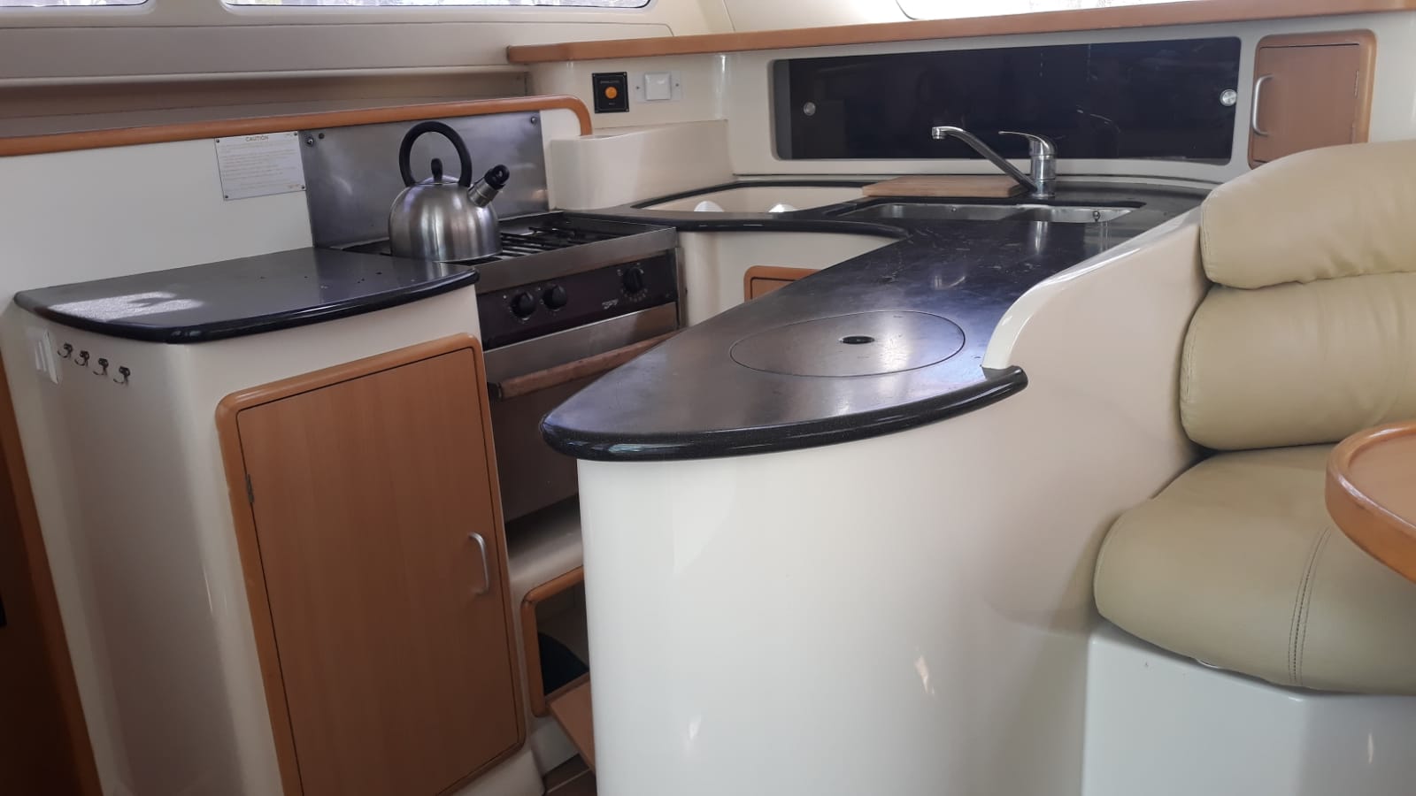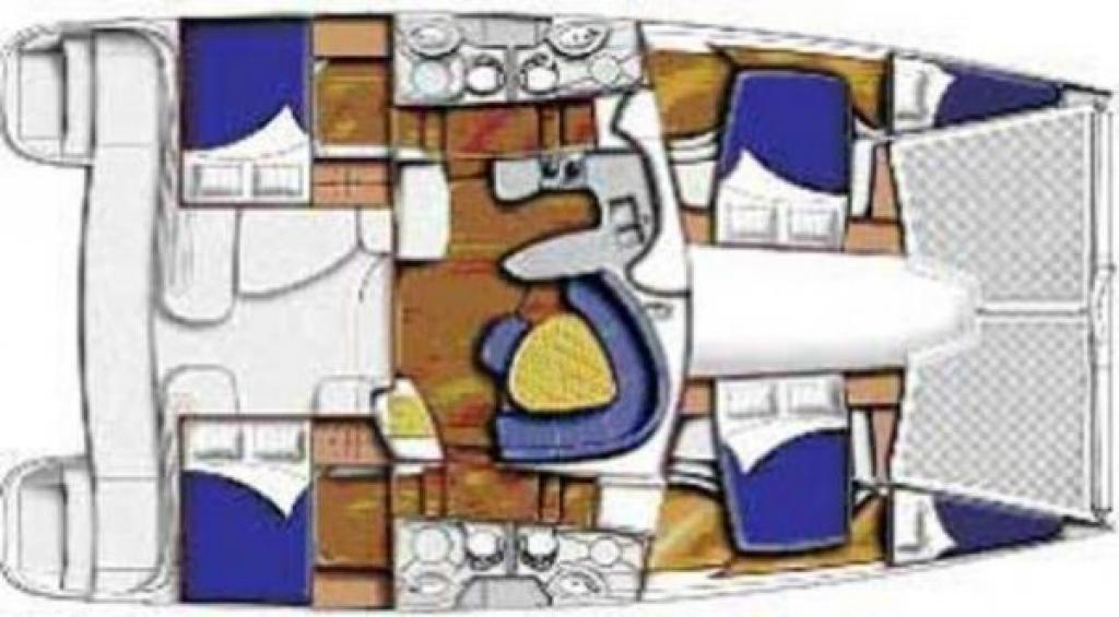 | Inside | 220V Steckdosen, Eisbox, Fäkalientank, Gasherd mit Backofen, Inverter 12V/220V, Klimaanlage (Landstrom), Kühlschrank, Landstromkabel, Radio mit CD und MP3, Salontisch absenkbar, Ventilatoren in Salon und Kabinen, Warmwasser |