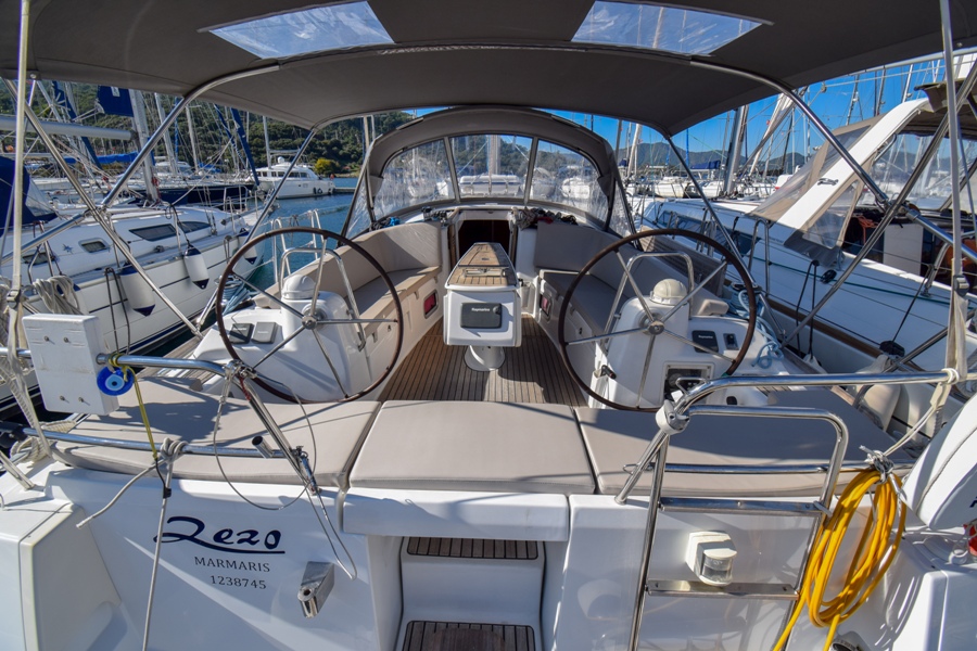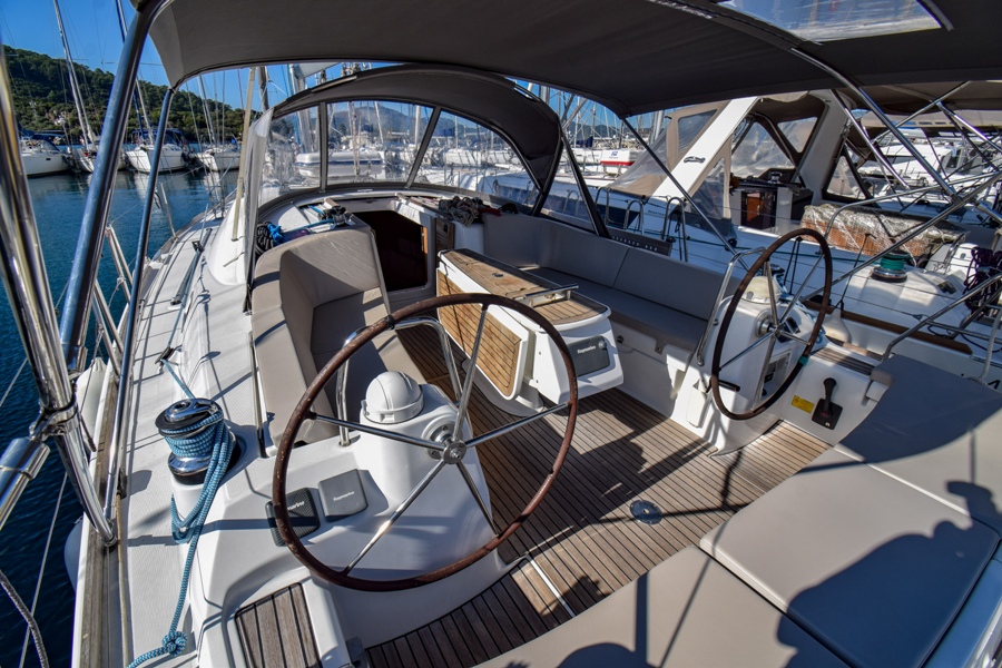 | Outside | 220 V-Landanschluss, Biminitop, Bolzenschneider, Bootshaken, Cockpitdusche, Cockpitlautsprecher, Cockpitleuchte, Cockpitpolster, Cockpittisch, elektr. Ankerwinsch, Fender, Gangway, Solaranlage, Sprayhood, Teak im Cockpit, Windex, Winschen |