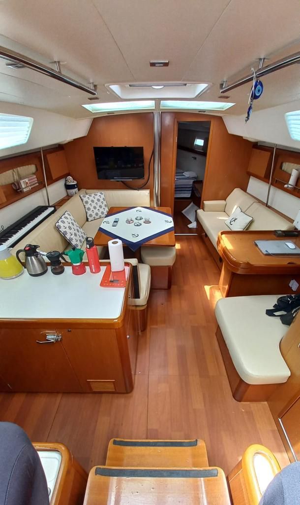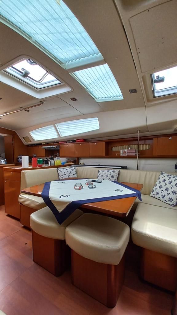 | Outside | 220 V-Landanschluss, Anker mit Kette, Ankerkettenzähler, Badeleiter, Biminitop, Bootshaken, Cockpitdusche, Cockpitlautsprecher, Cockpitleuchte, Cockpitpolster, Cockpittisch, Deckbürste, Dieselkanister , elektr. Ankerwinsch, elektr. Winsch, Fender, Festmacherleinen, Gangway, Kugelfender, Kunststoff-Eimer (Pütz), Schnorchelausrüstung, Solaranlage, Sonnensegel, Sprayhood, Teak im Cockpit, Wantenschneider, Wasserkanister , Wasserschlauch, Windex, Winschen |