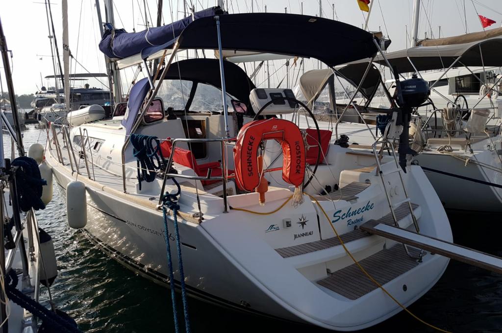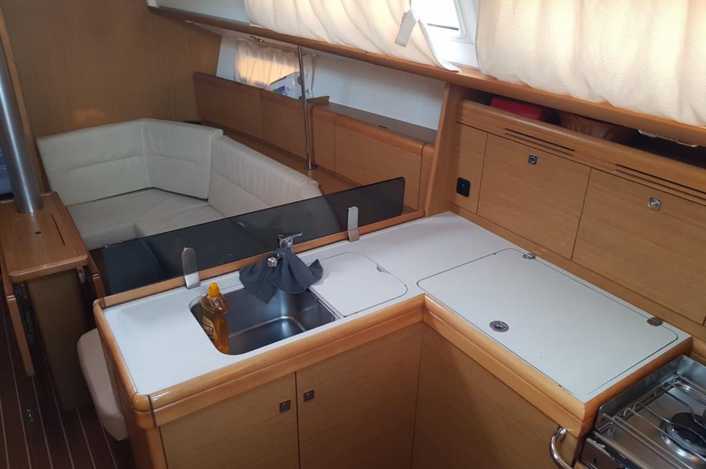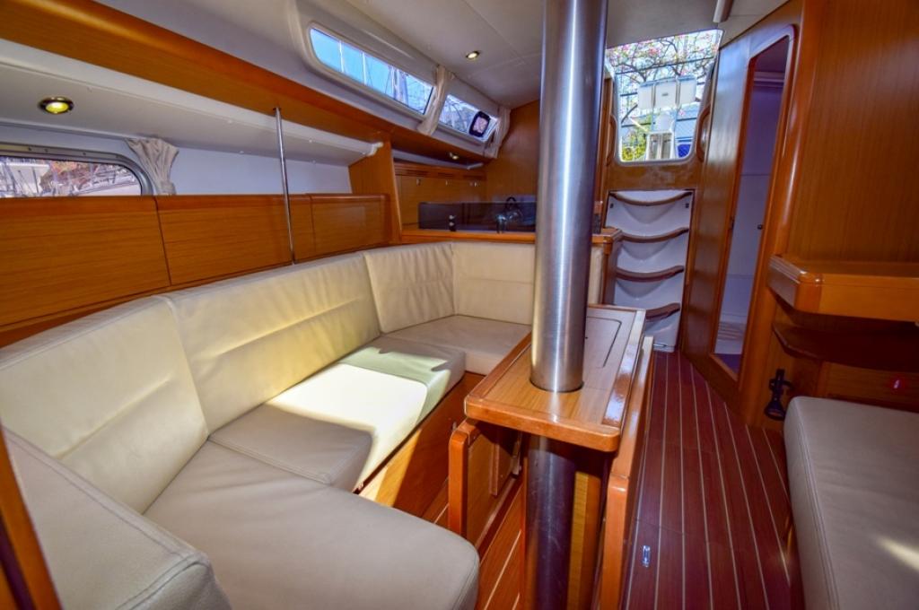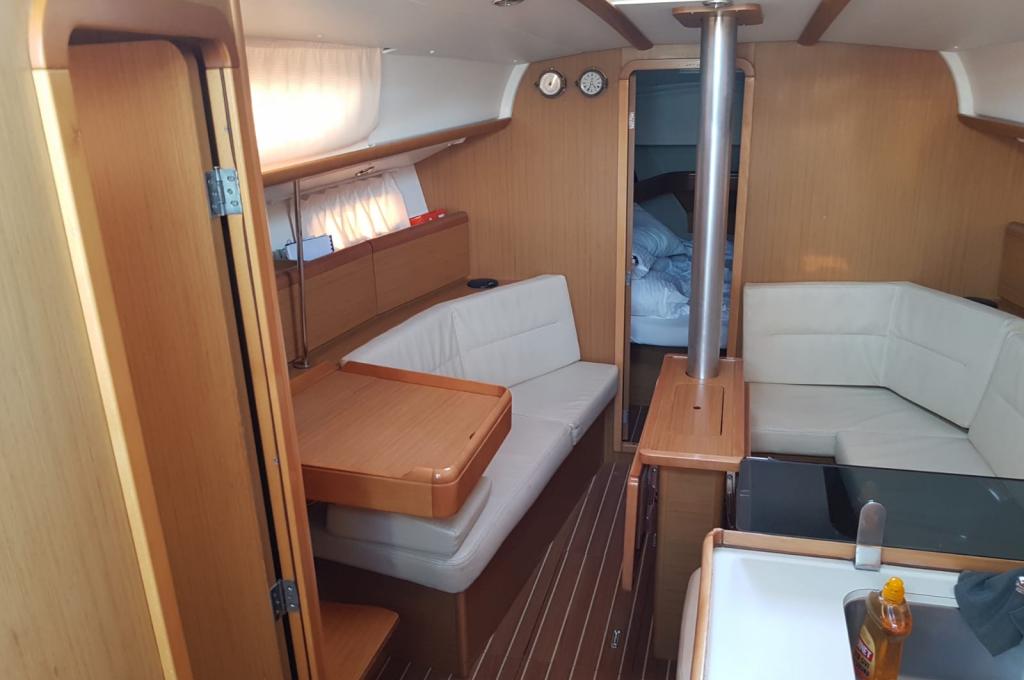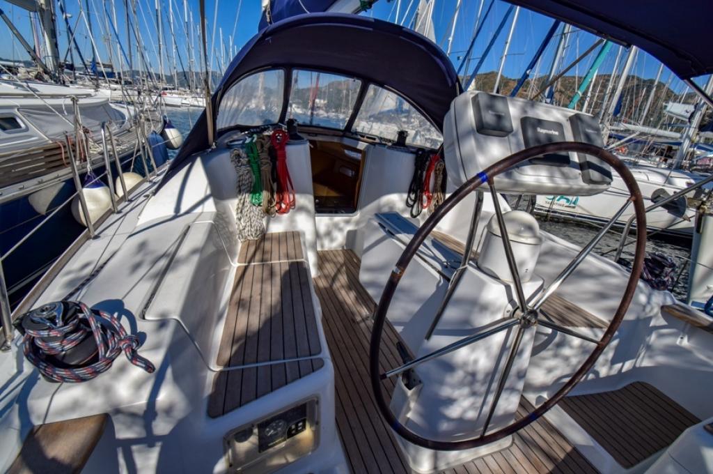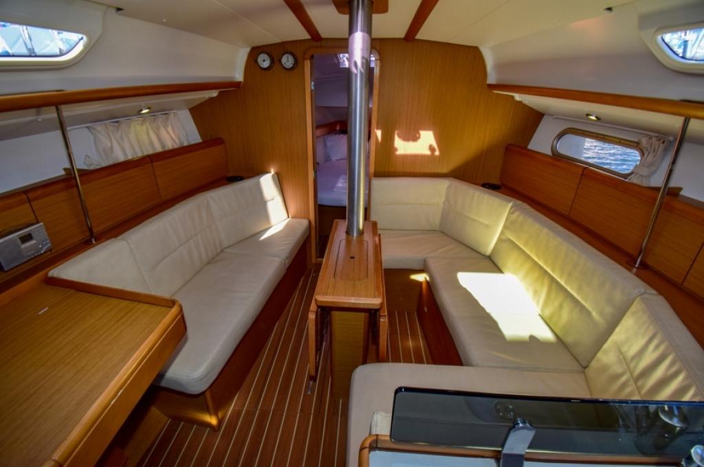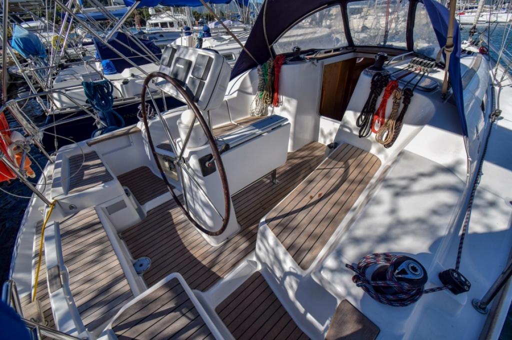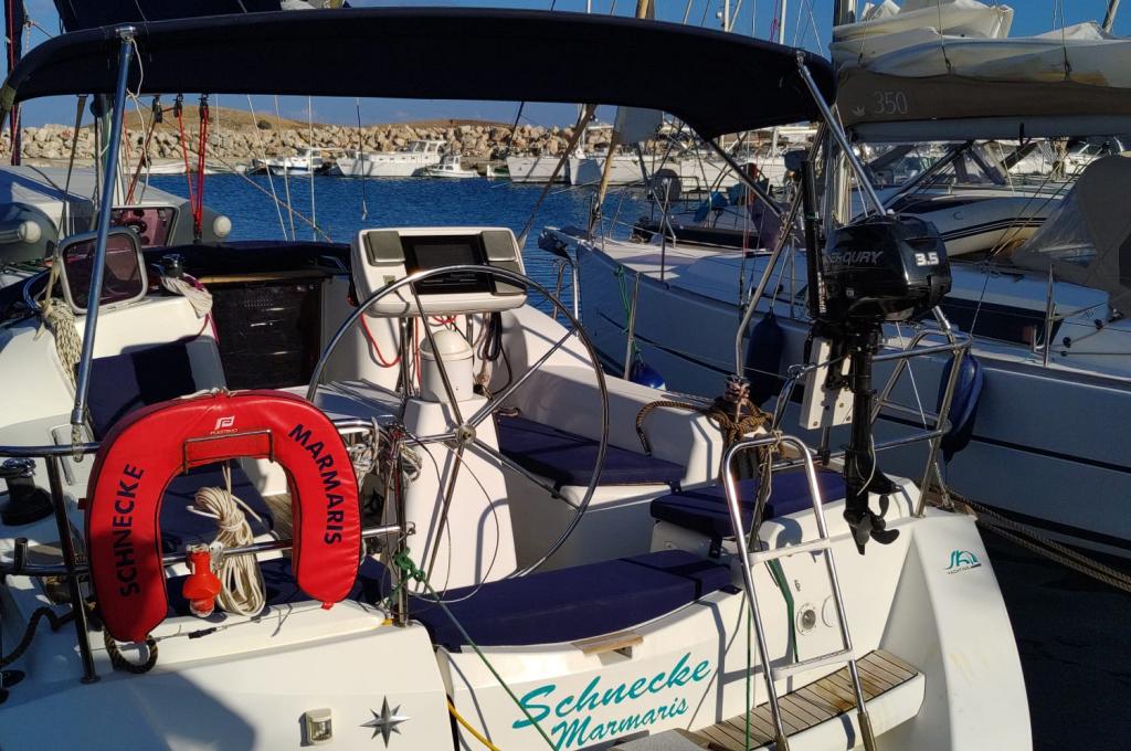 | Outside | 220 V-Landanschluss, Biminitop, Bolzenschneider, Bootshaken, Cockpitdusche, Cockpitlautsprecher, Cockpitleuchte, Cockpitpolster, Cockpittisch, elektr. Ankerwinsch, Fender, Gangway, Solaranlage, Sprayhood, Teak im Cockpit, Windex, Winschen |
