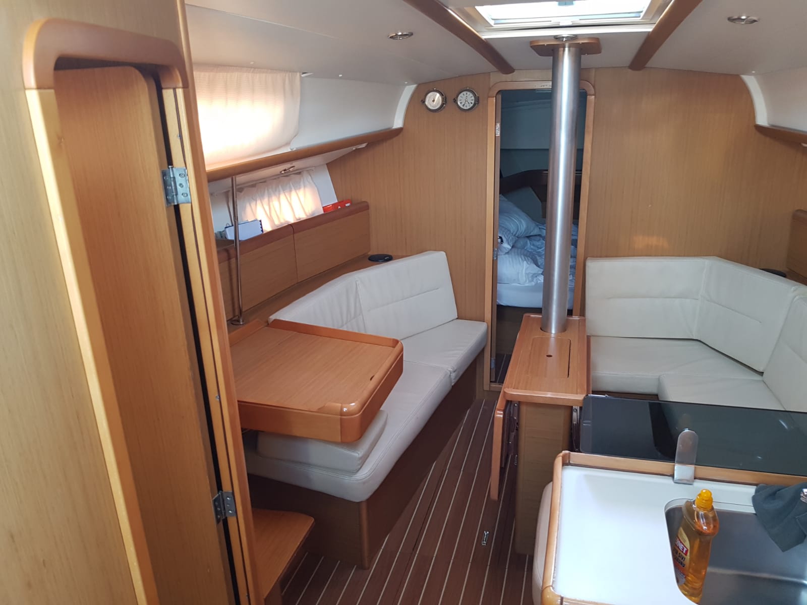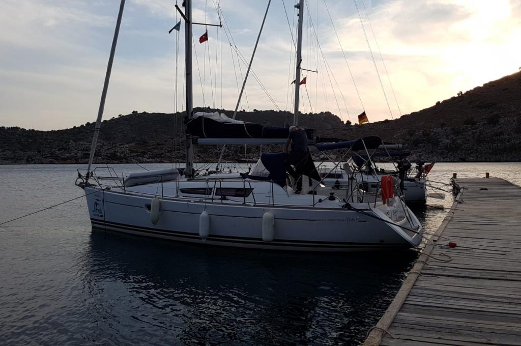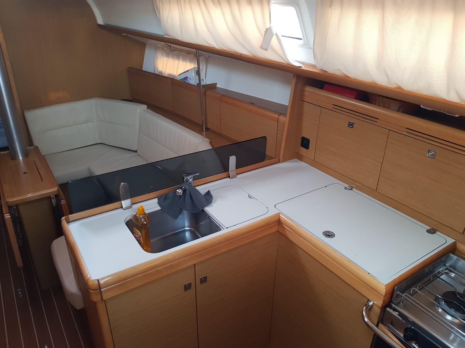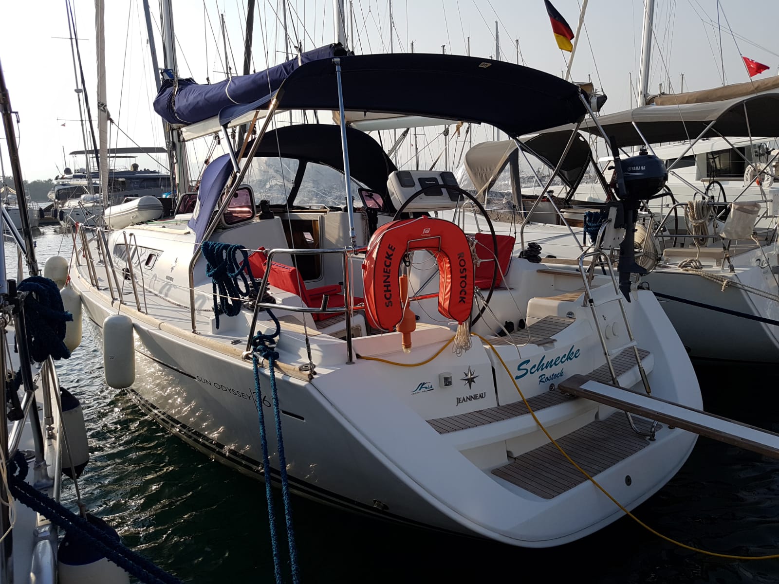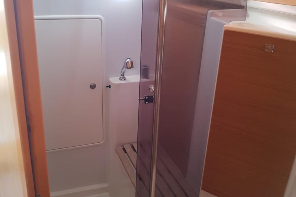 | Outside | 220 V-Landanschluss, Biminitop, Bolzenschneider, Bootshaken, Cockpitdusche, Cockpitlautsprecher, Cockpitleuchte, Cockpitpolster, Cockpittisch, elektr. Ankerwinsch, Fender, Gangway, Solaranlage, Sprayhood, Teak im Cockpit, Windex, Winschen |