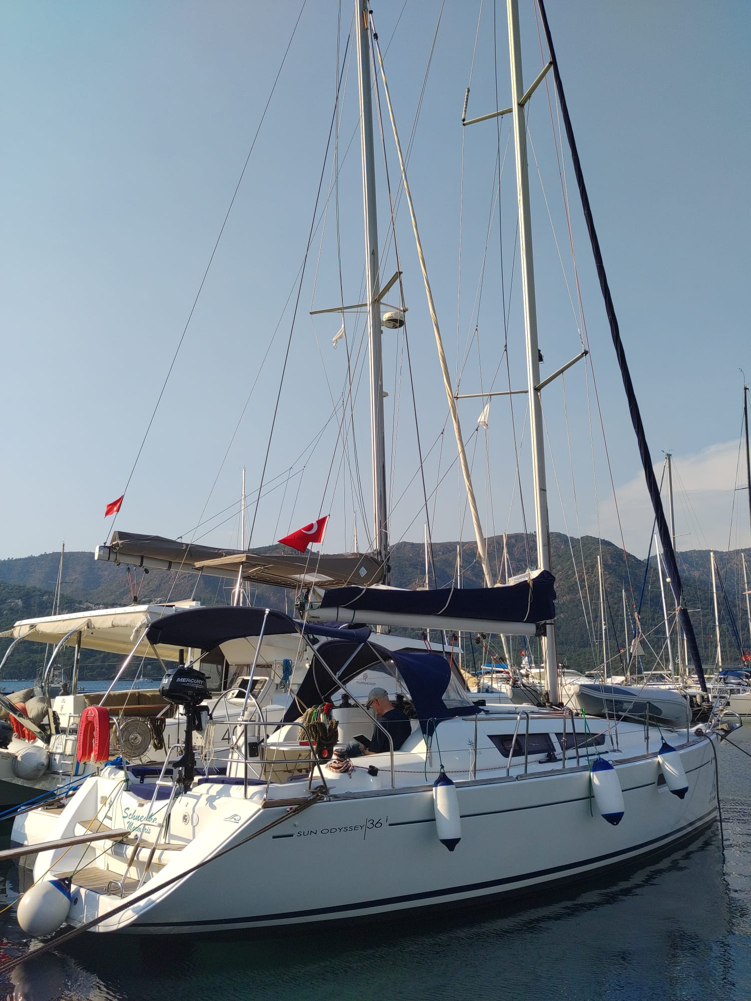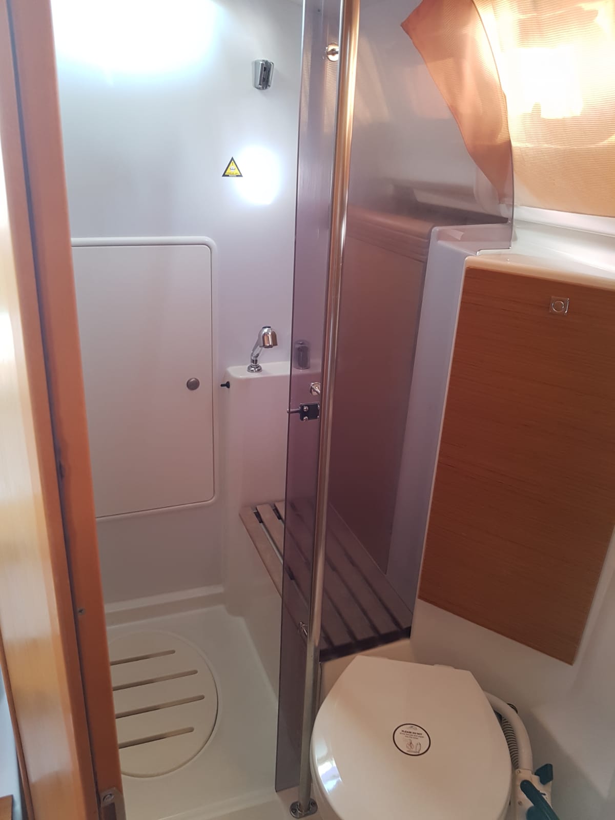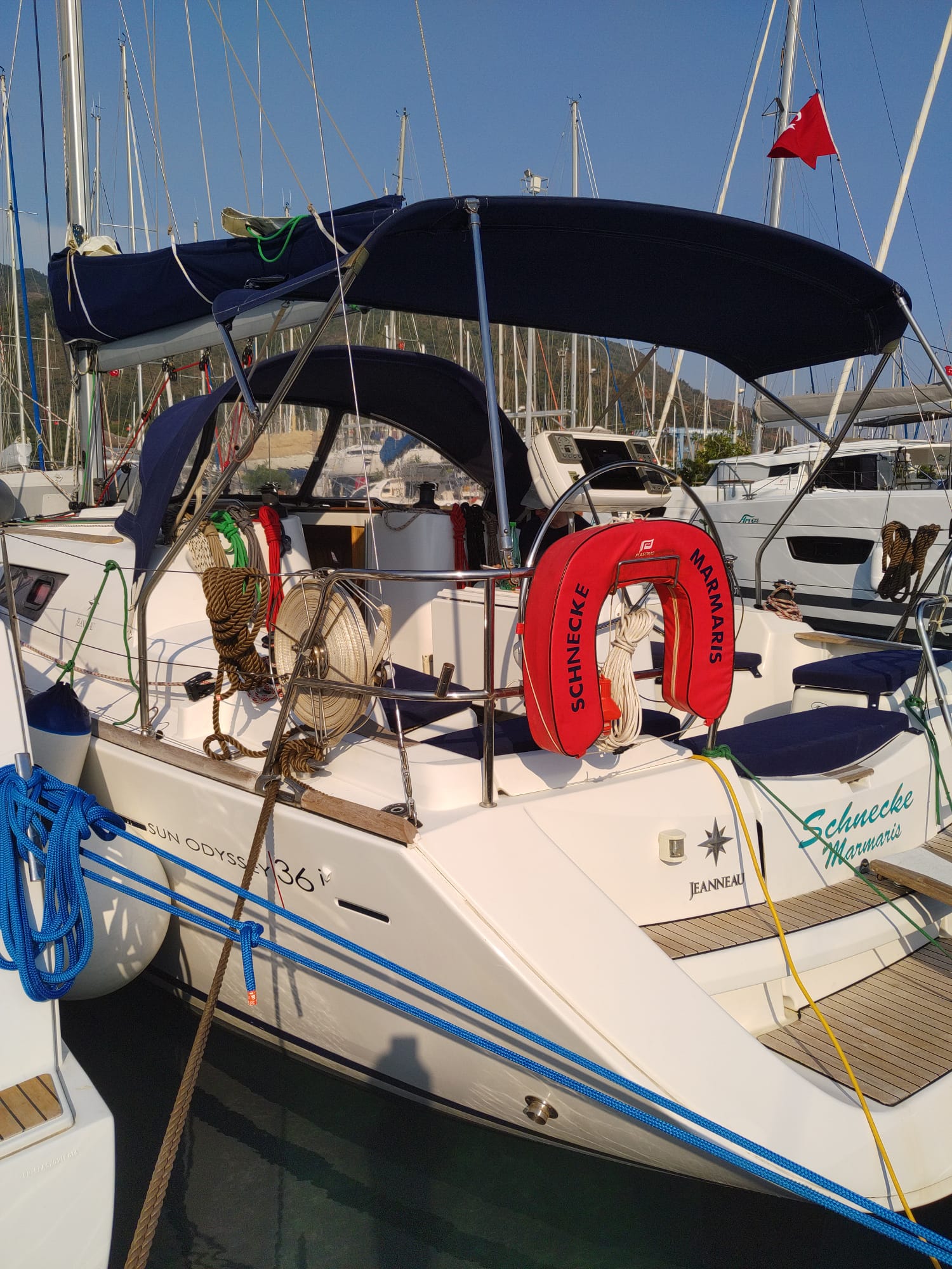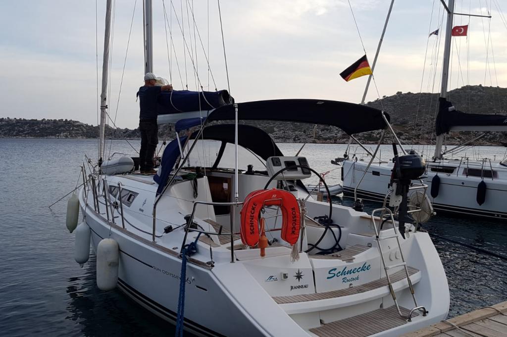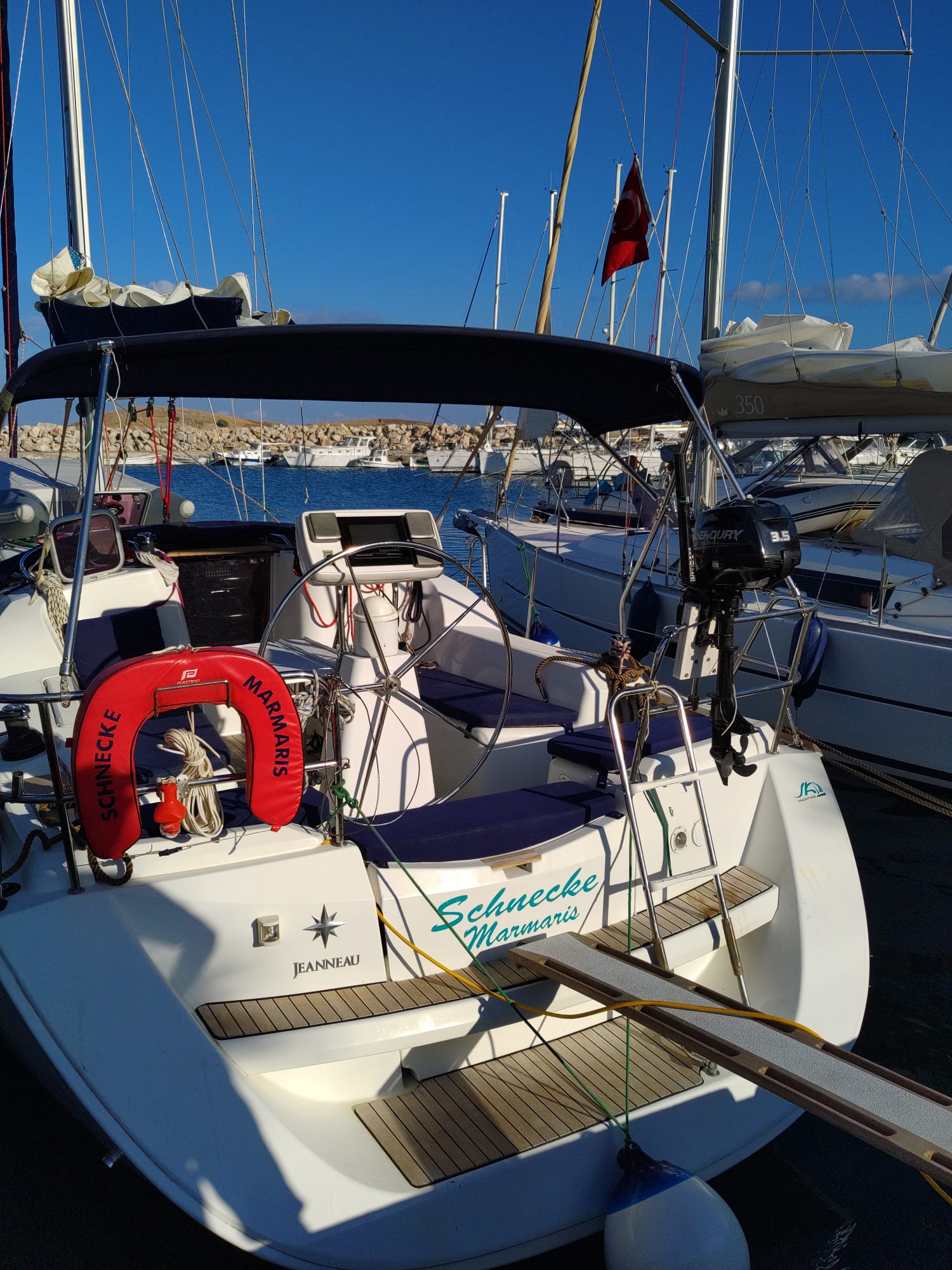 | Outside | 220 V-Landanschluss, Biminitop, Bolzenschneider, Bootshaken, Cockpitdusche, Cockpitlautsprecher, Cockpitleuchte, Cockpitpolster, Cockpittisch, elektr. Ankerwinsch, Fender, Gangway, Solaranlage, Sprayhood, Teak im Cockpit, Windex, Winschen |