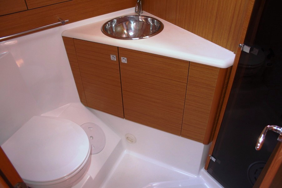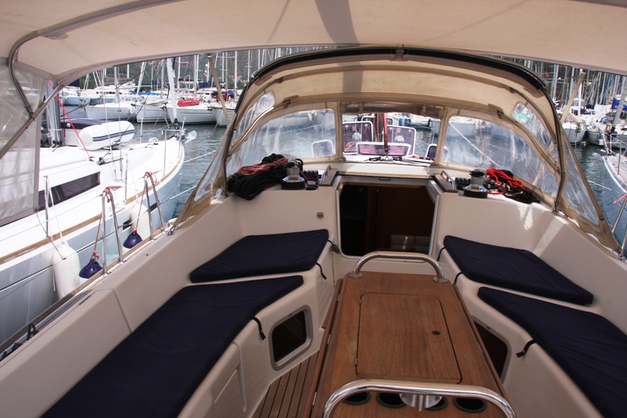 | Outside | 220 V-Landanschluss, Biminitop, Bolzenschneider, Bootshaken, Cockpitdusche, Cockpitlautsprecher, Cockpitleuchte, Cockpitpolster, Cockpittisch, elektr. Ankerwinsch, elektr. Winsch, Fender, Gangway, Solaranlage, Sprayhood, Teak im Cockpit, Windex, Winschen |