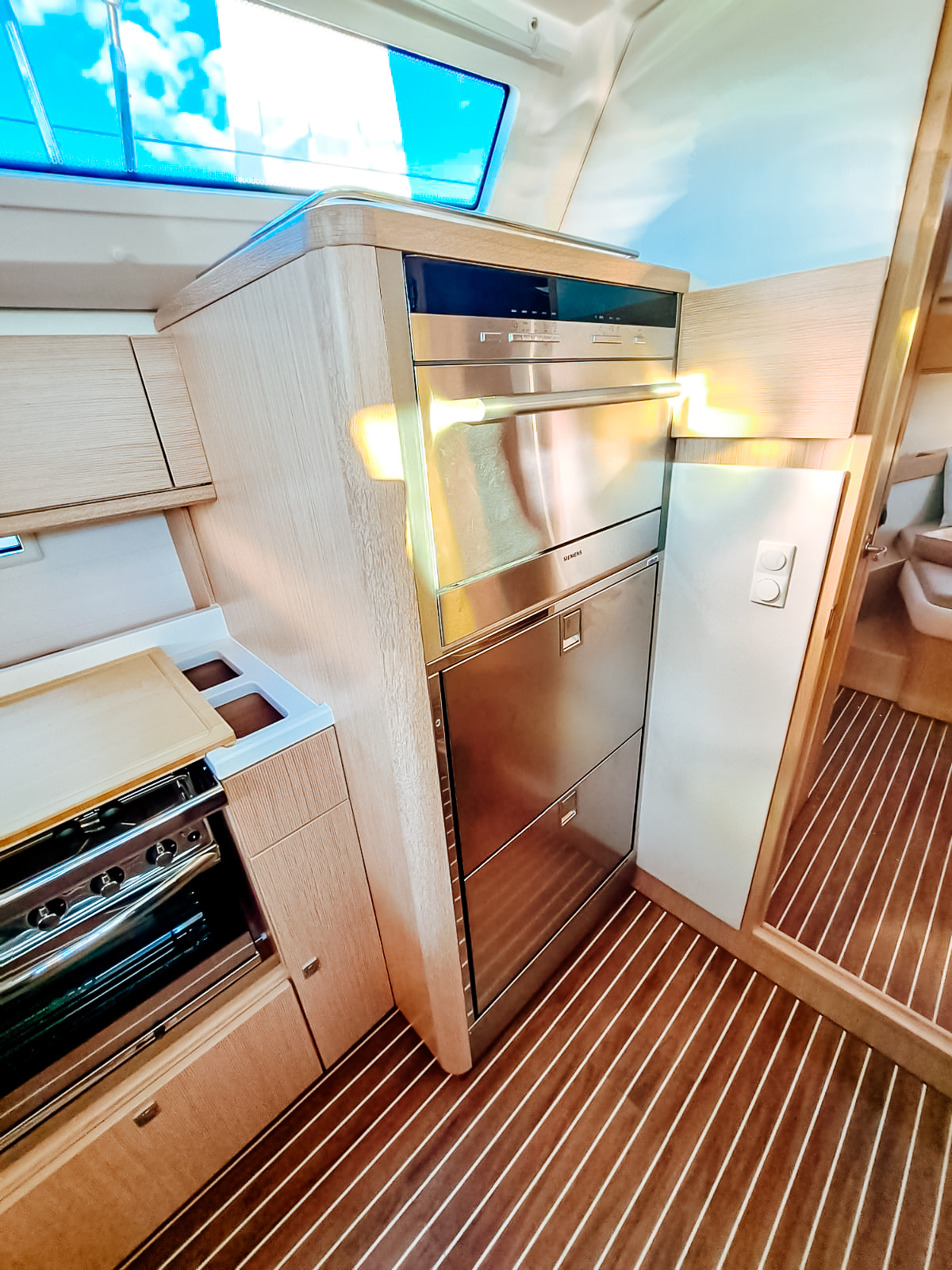 | Inside | Backofen, Borduhr, Gasherd, Gefrierschrank, Generator, Geschirrspüler, Inverter 12V/220V, Klimaanlage (ohne Landstrombedarf), Kühlschrank, Landstromkabel, Luftpumpe für Beiboot, Mikrowelle, Pantryausstattung, Radio mit CD und MP3, Trichter, Warmwasser, WC (elektr.) |