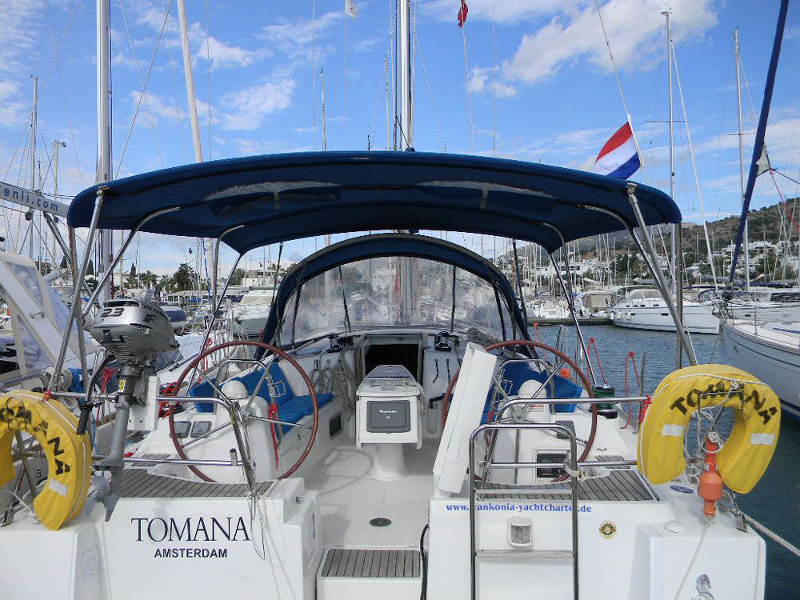 | Outside | Anker mit Kette, Außendusche, Badeleiter, Biminitop, Bootshaken, Cockpitlautsprecher, Cockpitpolster, elektr. Ankerwinsch, Fender, Festmacherleinen, Gangway, Solaranlage, Sprayhood, Wasserschlauch, Winschen |