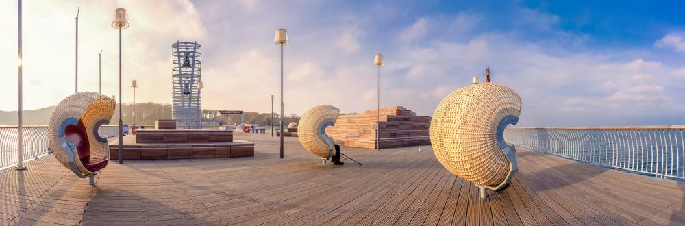 Die 2021 nach langer Renovierung eröffnete Seebrücke Koserow bietet mit Ihrem modernen Desing einiges zum Entdecken. © stylefoto24/AdobeStock